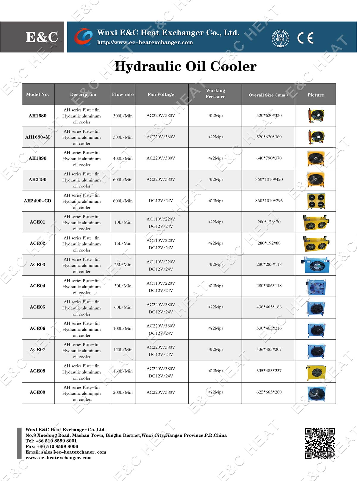 As energy transfer medium, hydraulic oil plays a key role in lubrication, anti-corrosion, anti-rust and cooling. E&C provides standard hydraulic oil cooler with capacity of 10-200L/min for mobile machinery, hydraulic stations and other systems. And Please contact us for catalogue and details. |